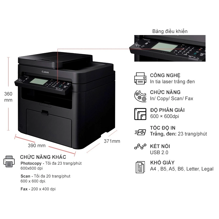 Được ví như một "trợ lý" văn phòng đắc lực, Canon imageCLASS MF235 tích hợp đầy đủ các chức năng thiết yếu bao gồm in ấn, quét ảnh, sao chép và gửi fax. Việc sở hữu một thiết bị đa năng giúp doanh nghiệp linh hoạt hơn trong công việc, tiết kiệm đáng kể chi phí mua sắm thiết bị rời và tối ưu hóa diện tích phòng làm việc.