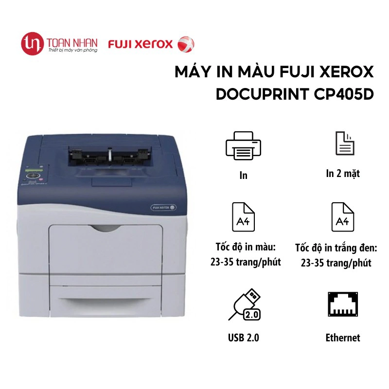 Máy in đơn năng laser màu Fuji Xerox Docuprint CP405D là dòng sản phẩm sở hữu phong cách thiết kế hiện đại với gam màu trắng sang trọng, phù hợp cho mọi không gian làm việc. Thiết bị nổi bật với khả năng xử lý văn bản nhanh chóng đạt tốc độ 35 trang/phút (in một mặt) và 23 trang/phút (in hai mặt), kết hợp cùng công nghệ mực in tiên tiến giúp tạo ra những bản in có độ sắc nét cực cao.
