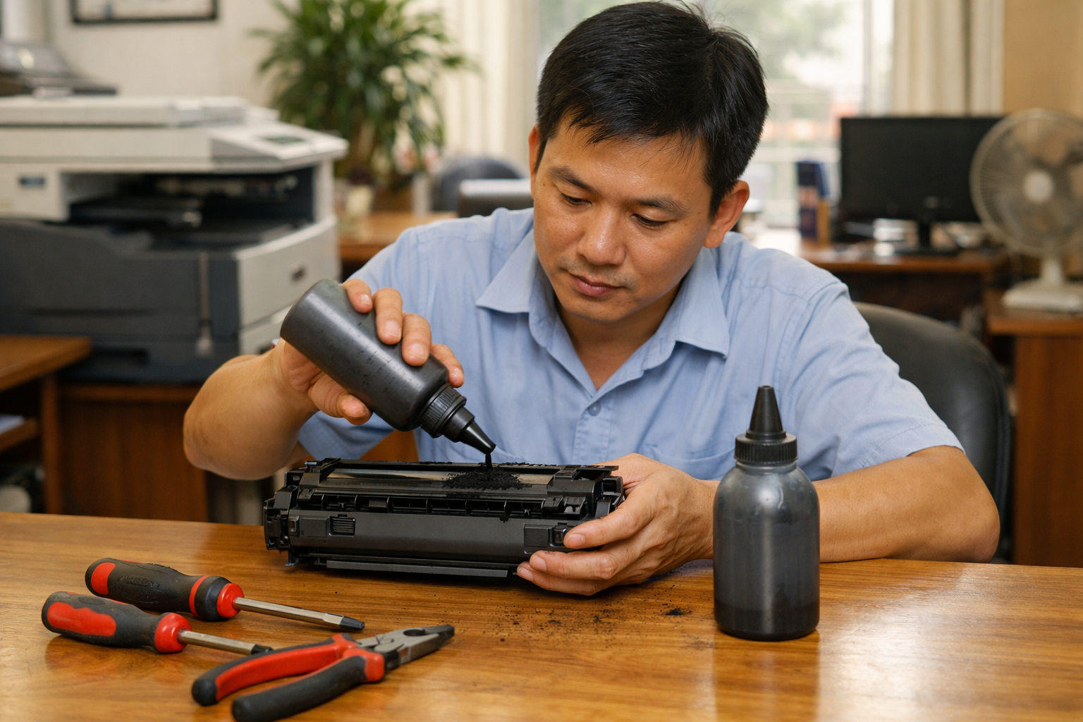 Dù việc tự nạp mực có thể thực hiện được, nhưng nếu thao tác không chuẩn có thể dẫn đến hỏng trống (drum) hoặc làm rơi mực vào máy gây chập cháy mạch điện. Để an tâm tuyệt đối, quý khách có thể liên hệ với CÔNG TY TNHH THIẾT BỊ MÁY VĂN PHÒNG MAI HOÀNG. Chúng tôi cam kết cung cấp loại mực chất lượng nhất, giúp bản in luôn sắc nét và bảo vệ tối đa tuổi thọ máy in của bạn.