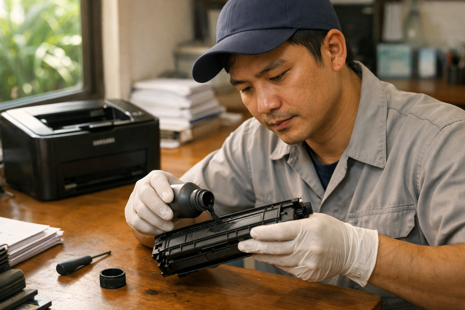 - Kỹ thuật viên tay nghề cao: Đội ngũ nhân viên được đào tạo chuyên sâu, thao tác cẩn thận, sạch sẽ, đảm bảo không làm rò rỉ mực ra máy hay văn phòng của khách hàng.