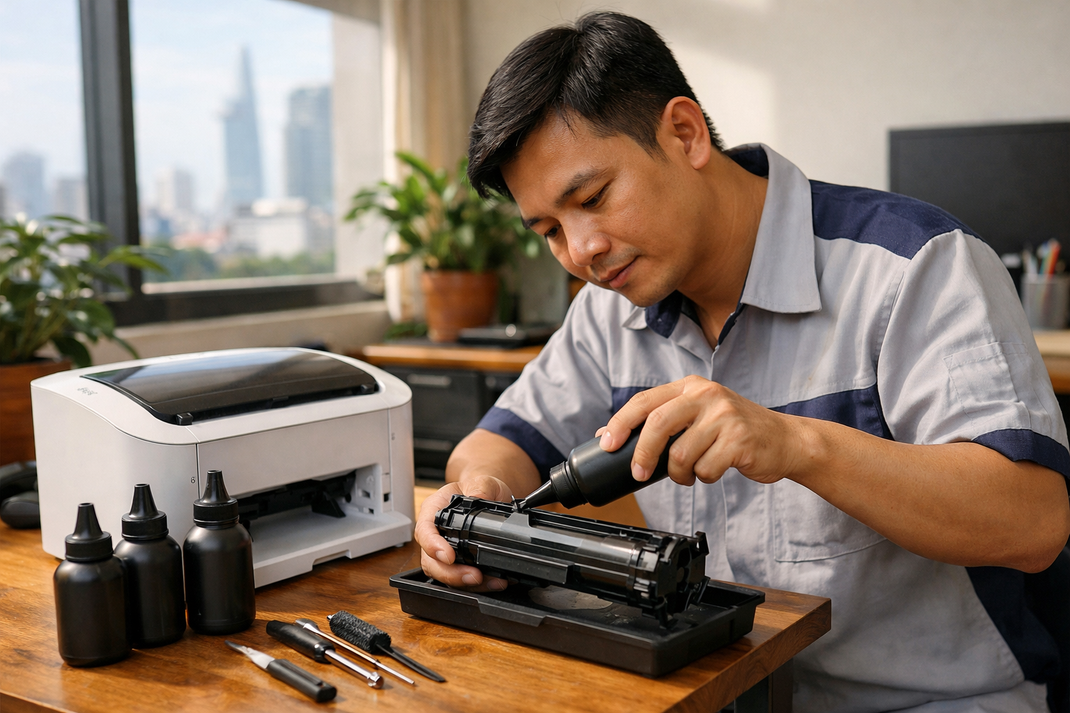 - Bảo hành tận tâm: Hỗ trợ xử lý hoàn toàn miễn phí nếu có bất kỳ lỗi phát sinh nào sau khi bơm mực.