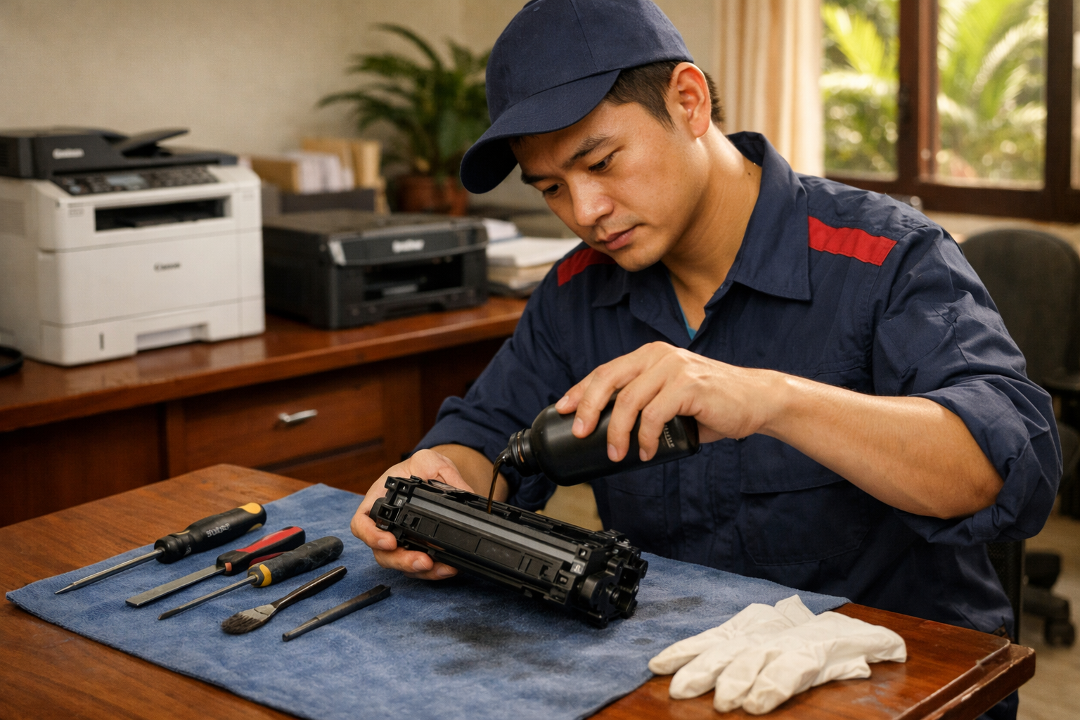 - Kỹ thuật chuyên sâu: Nhân viên được đào tạo bài bản, thao tác nhanh gọn, sạch sẽ, không làm rơi vãi mực ra văn phòng.